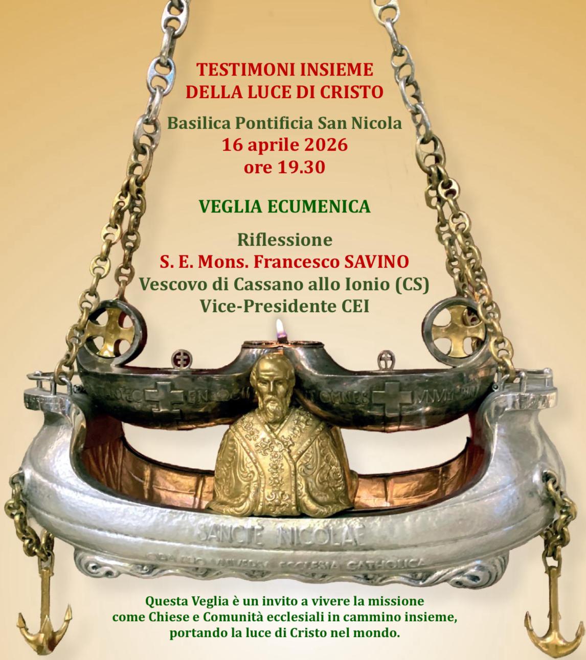 Altri documenti Fare luce, non scintille! Testimoni e missionari, insieme, della luce di Cristo Basilica Pontificia “San Nicola”, Bari – 16 aprile 2026 La Chiesa non è chiamata a “fare rumore” per farsi notare: è chiamata a riflettere la luce di Cristo. “Fate luce, non scintille!” –– esortava il venerabile don Tonino Bello. Quando una comunità vive davvero ciò che annuncia, allora la missione diventa credibile: non per slogan, ma per testimonianza di… Read More
