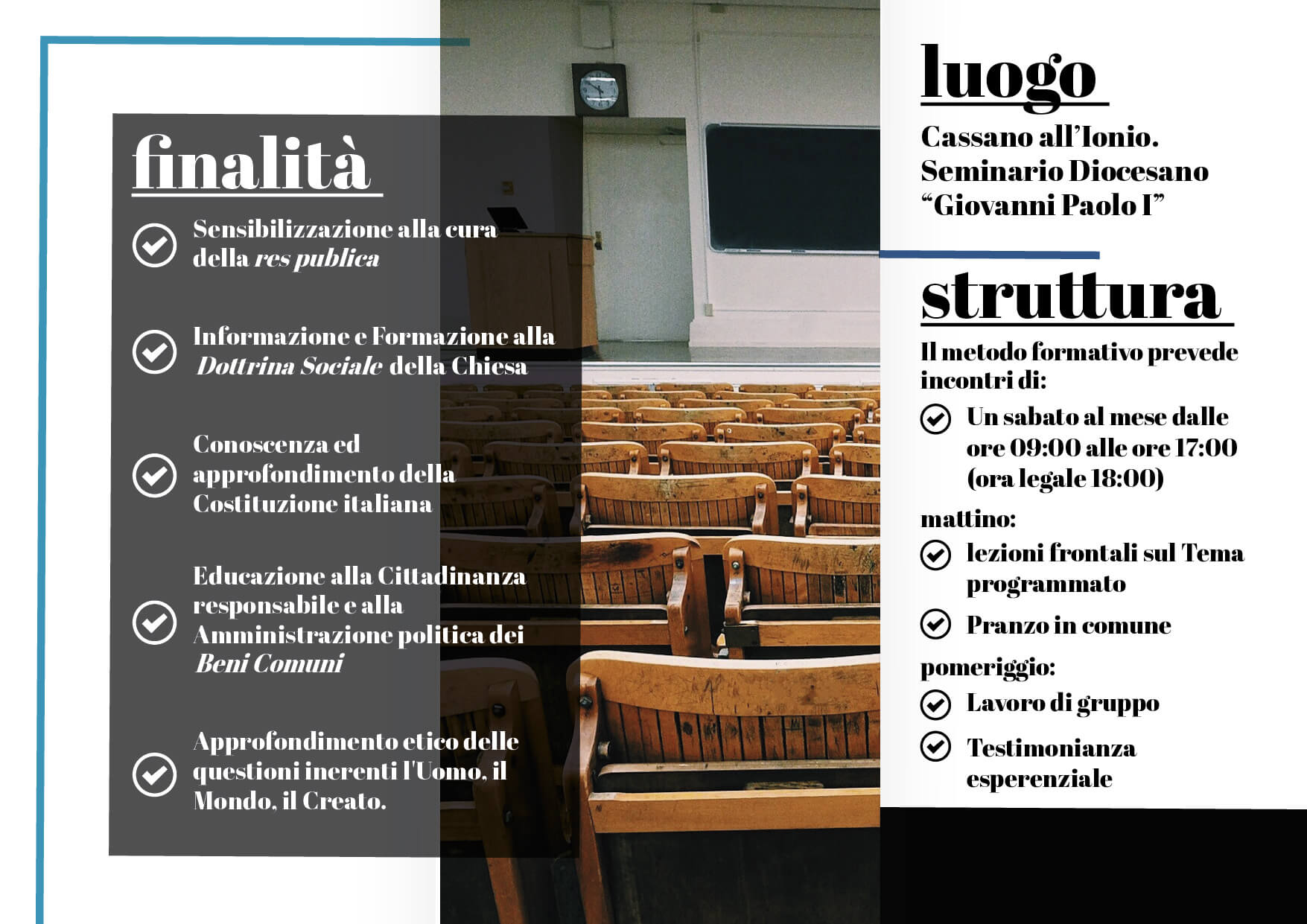 In un contesto come il nostro, segnato dalla disaffezione ai temi della politica e dallo scarso senso di appartenenza alla comunità, l’iniziativa diviene – per mons. Savino – un compito indispensabile e carico di significato e responsabilità. Educare alla politica risponde ad un bisogno sociale. La finalità del progetto è quella di suscitare e sensibilizzare un fare attivo e partecipativo alla vita politica del paese. Il concetto di cittadinanza – secondo Savino – si riferisce a una condizione politica e sociale non solo di appartenenza, ma anche di partecipazione. Il nostro tempo lo richiede con urgenza: l’alternativa rischia di essere il tracollo dell’intera umanità e l’irrealizzabilità per la persona di penetrare la verità del suo stesso statuto epistemologico.