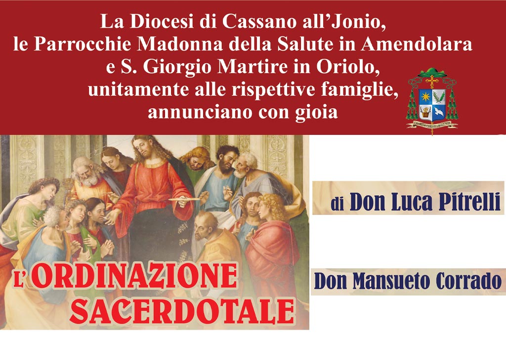 La Diocesi di Cassano All’Jonio si arricchisce di nuovi presbiteri. Si prostreranno ai piedi dell’altare con il volto rivolto al suolo, in segno di umiltà e di dono della propria vita al Signore, mentre tutta la Chiesa pregherà per loro. Un lungo momento di orazione, particolarmente suggestivo e accompagnato dalle litanie dei santi, che precede l’imposizione delle mani da parte del Vescovo, Mons. Francesco Savino, domenica 17 luglio, alle ore 18.30, nella Basilica Minore Cattedrale. Don Luca Pitrelli e don Mansueto Corrado, pronunceranno il loro “Eccomi”, singola parola che racchiude in sé l’offerta di una vita.