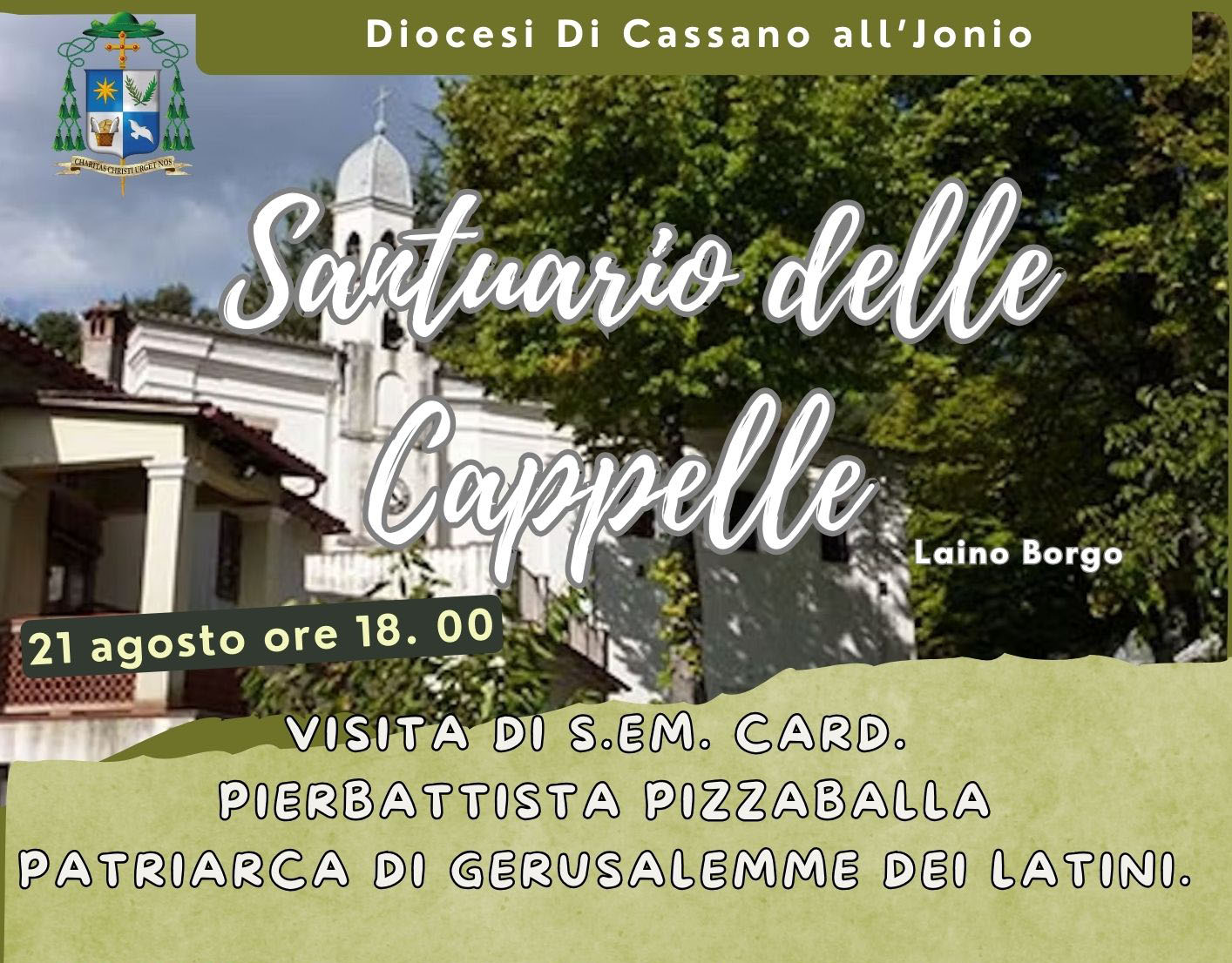 Mercoledì 21 agosto, presso il Santuario delle Cappelle a Laino Borgo sarà presente Sua Eminenza il Cardinale Pierbattista Pizzaballa, Patriarca di Gerusalemme dei Latini. Ad accoglierlo il Vescovo della Diocesi di Cassano All’Jonio e vice presidente della CEI, S. E. Rev.ma Mons. Francesco Savino. La visita inizierà alle ore 18 con l’accoglienza del Cardinale presso il santuario delle Cappelle conosciuto anche come Santuario del Santo Sepolcro o di Maria Santissima dello Spasimo, che è situato nel territorio comunale di Laino Borgo, immerso in un suggestivo paesaggio incontaminato. Si procederà alla visita del suggestivo luogo di spiritualità che è annoverato come la Gerusalemme del Sud. All’interno della chiesa si terrà un incontro – testimonianza che saranno anticipati dai saluti del Vescovo della Diocesi Mons. Savino, del Sindaco di Laino Borgo Mariangelina Russo e di Mons. Vincenzo Calvosa Vescovo di Vallo della Lucania