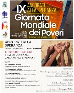 La Diocesi di Cassano all’Jonio e la Caritas diocesana invitano gli organi di stampa, il mondo associativo e l’intera cittadinanza alla presentazione del Report diocesano sulle povertà, dal titolo “Dentro le ferite: la speranza che organizza futuro”, in programma martedì 16 dicembre alle ore 18.00 presso il Teatro Comunale di Cassano all’Ionio (CS).