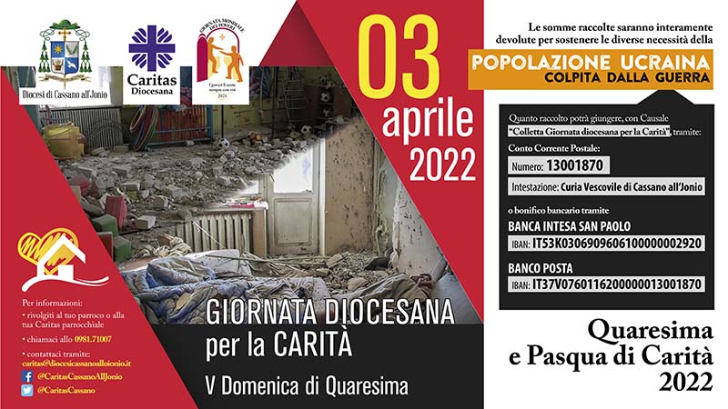 Nella V domenica di Quaresima (3 aprile), in occasione della Giornata diocesana per la Carità, vi ricordiamo di pregare fortemente per la Pace e di non trascurare la Colletta diocesana. Tale forma di partecipazione e di comunione, come ben sapete, permetterà di continuare a provvedere alle diverse necessità della popolazione ucraina, che conta ormai tantissimi profughi, tantissimi morti, vittime innocenti, inermi, che avrebbero voluto vivere in pace con tutti.