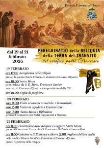 A seguire, la celebrazione eucaristica sarà presieduta da Francesco Savino, seguita da una veglia di preghiera, occasione per sostare in silenzio e affidare al Santo di Assisi le speranze e le fatiche della comunità.