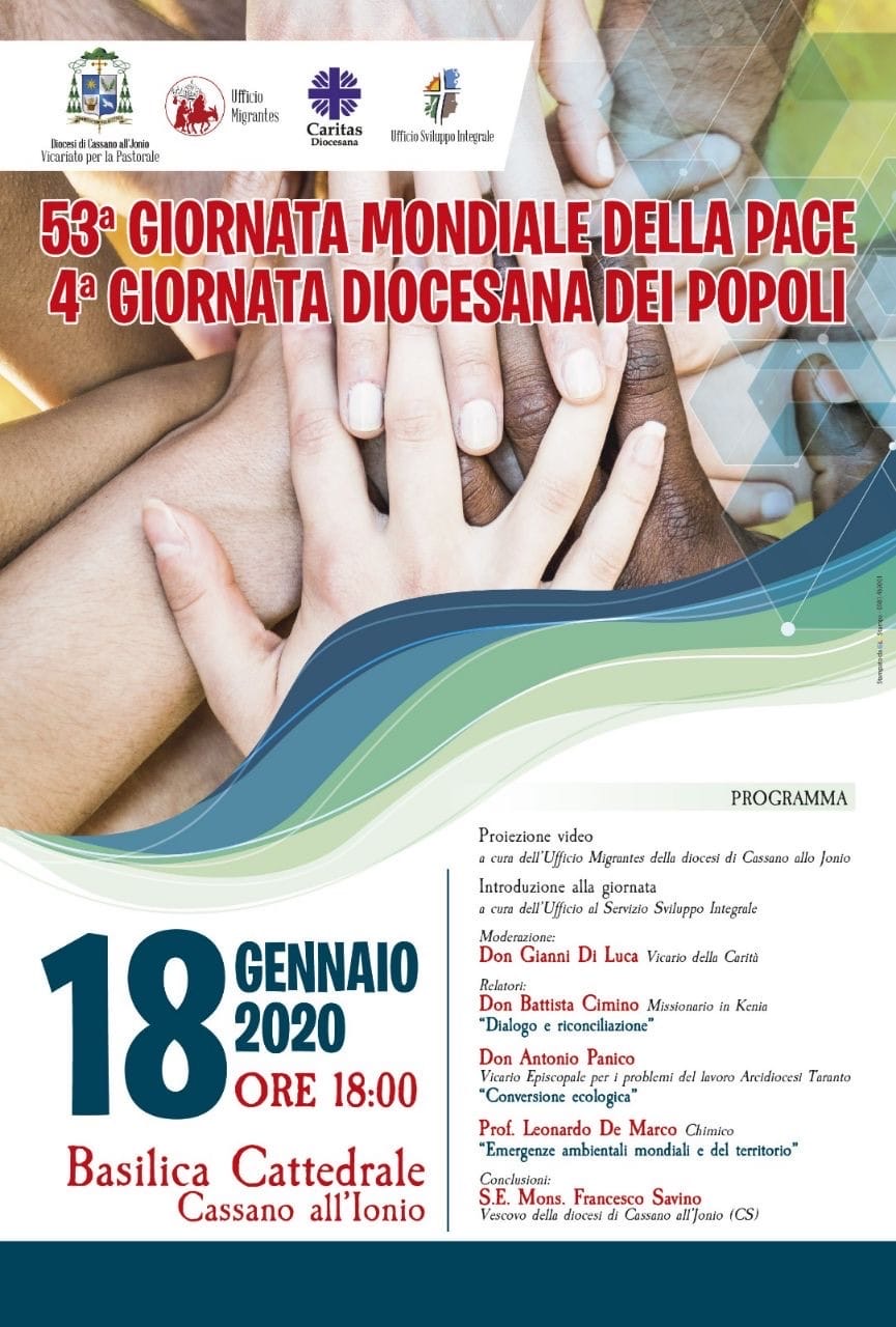 Si terrà sabato 18 Gennaio, alle ore 18, nella Basilica Cattedrale di Cassano all’Ionio, il consueto appuntamento di inizio anno per celebrare la Giornata Mondiale della Pace e la Giornata diocesana dei Popoli, giunte, rispettivamente alla 53esima edizione e alla quarta.
