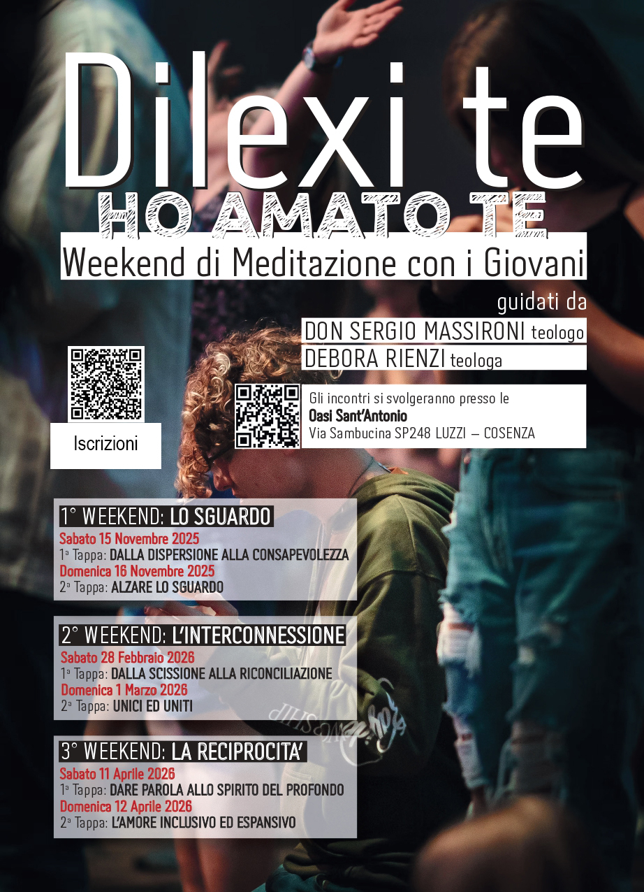 L’Ufficio di Pastorale Giovanile e Vocazionale della Diocesi di Cassano all’Ionio propone un percorso speciale per i giovani: β€œDilexi te – Ho amato te”, tre weekend di meditazione guidati dal teologo don Sergio Massironi e dalla teologa Debora Rienzi, presso l’Oasi Sant’Antonio a Luzzi (CS).