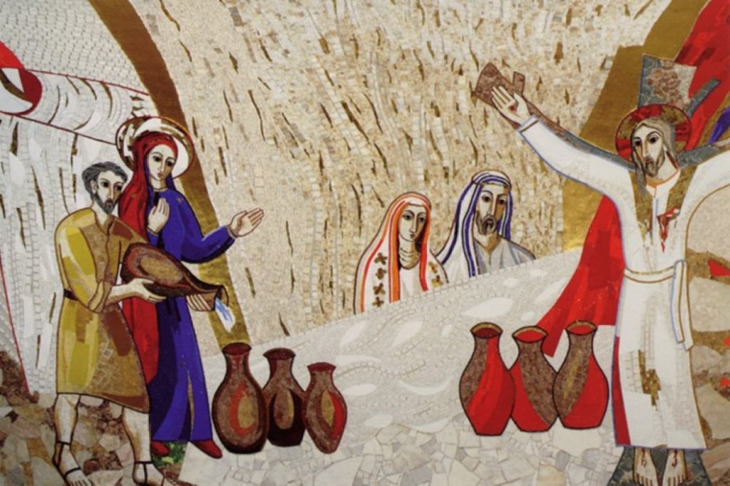 Gesù compie un segno in cui anticipa la sua ora: i servi portano sei giare piene di acqua che erano usate per la purificazione. Quest’acqua, che secondo l’interpretazione dei Padri della Chiesa, rappresenta tutta l’economia dell’Antica Alleanza, grazie alla presenza di Gesù è la bevanda messianica della Nuova Alleanza. E’ interessante constatare che il maestro di tavola “non sapeva da dove venisse quel vino”, mentre i servi che avevano obbedito alla Parola di Dio, sanno che quel vino viene da Lui. Il segno di Cana è simbolico: le nozze e l’alleanza tra Gesù e la sua Chiesa, è l’amore donato da Gesù che continua ad essere donato e che non manca a tutti noi.