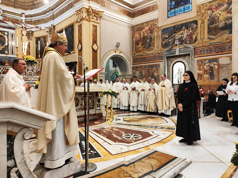 Che felice coincidenza, dunque, in questa Domenica, in cui ci sentiamo tutti rigenerati dall’incontro con il Risorto, con la professione perpetua di Suor Fabrizia Molinaro, a cui personalmente voglio tanto bene, insieme con la sua comunità delle Piccole Operaie dei Sacri Cuori, i suoi alunni e le persone che hanno avuto la gioia di incontrarla sui sentieri della sua vita. Che stupore: Suor Fabrizia farà solennemente i voti di povertà, castità e obbedienza! Una follia per una parte di mondo che spesso ha solo occhi per la realtà materiale. Non si tratta, è giusto puntualizzarlo, di ripudiare o disprezzare quelle caratteristiche umane molto belle che costituiscono la persona umana. Si tratta evidentemente di amare tutta la realtà a partire dalle persone con il cuore pieno e le mani vuote, senza atteggiamenti o voglia di possesso. Suor Fabrizia, dopo un discernimento sapienziale, accompagnata dalle persone che hanno avuto il compito di aiutarla in questo cammino che l’ha portata alla scelta definitiva, è chiamata a vivere con radicalità il suo amore per la Parola di Dio e l’Eucaristia, il suo amore per il carisma che il fondatore, il Beato Francesco Maria Greco, ha trasmesso alle Piccole Operaie dei Sacri Cuori e l’amore soprattutto per i giovani, verso i quali Suor Fabrizia ha da sempre manifestato una particolare attenzione. Non lasciarti mai scoraggiare dagli eventi spesso paradossali che potranno accadere nella tua vita, poiché è bene non dimenticare che Gesù ha affidato la “barca” della sua comunità, che è la Chiesa, a Pietro, un uomo dalle grandi passioni ma al tempo stesso un uomo abitato da fragilità, come noi tutti. Non ti mancherà mai la Grazia di Cristo che cercherai di vivere come primato assoluto della tua vita. Un augurio tutto speciale voglio rivolgerti: se ti lascerai “spiritualmente” lavare i piedi da Gesù, sorprendendoti come fu sorpreso Pietro, la tua vita sarà sempre un servizio generoso e gratuito nei confronti delle persone che incontrerai sulla tua vita. Kenotizza sempre, cioè svuota sempre il tuo “io” da ogni pretesa idolatrica, soprattutto narcisistica e coerentemente con il carisma del tuo Fondatore, cerca sempre di imitare i Sacri Cuori di Gesù e di Maria e al tempo stesso, mai come in questo momento particolare della storia, non stancarti mai di donare tutta la tua vita per l’evangelizzazione, che ha sempre bisogno di persone passionali, generose e credibili. Non lasciarti rubare il sorriso che tutti osserviamo sul tuo volto, un sorriso che dice l’armonia che cerchi di vivere nella tua esistenza tra l’ideale, la volontà di Dio, e la tua realtà, il tuo vissuto.