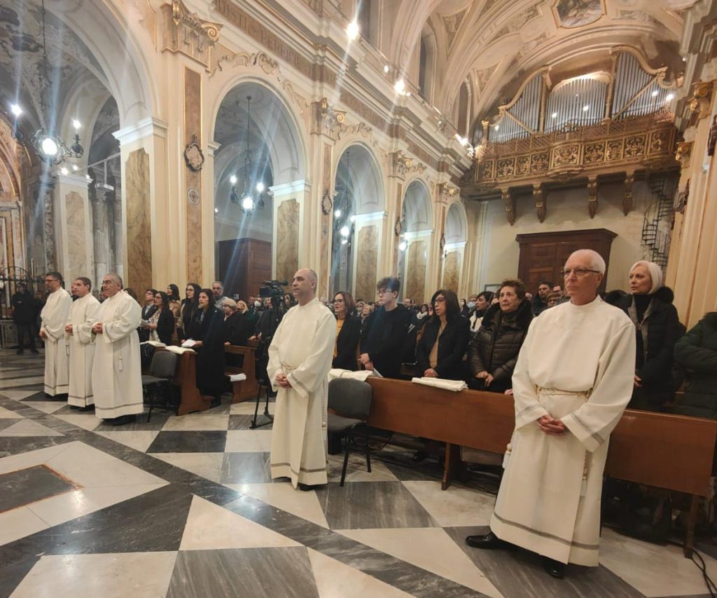Siate, cari diaconi, ascoltatori della parola e testimoni fedeli e credibili. Delle tre diaconie quella della carità, sin dalle origini, ha meglio caratterizzato il grado diaconale. Infatti, nella interrogazione sui vostri impegni si dice perentoriamente “di esercitare il ministero del diaconato con umiltà e carità in aiuto all’ordine sacerdotale, al servizio del popolo cristiano”. Desidero dire a tutti questa sera che da questa celebrazione parta la prospettiva di essere soprattutto Diaconi permanenti della carità permanente. Ringrazio di cuore per l’accompagnamento che avete ricevuto i vostri parroci con le rispettive comunità, don Giovanni, don Giuseppe e Padre Norbert, Leonardo Aita, che presiede l’Ufficio Diocesano dei Ministeri e del Diaconato Permanente, tutti gli altri diaconi della Diocesi, le vostre mogli con i vostri figli. L’augurio più bello che posso rivolgervi è che con la vostra vita possiate rendere più autentico il Vangelo di Gesù e rendere più bella la nostra Chiesa locale.