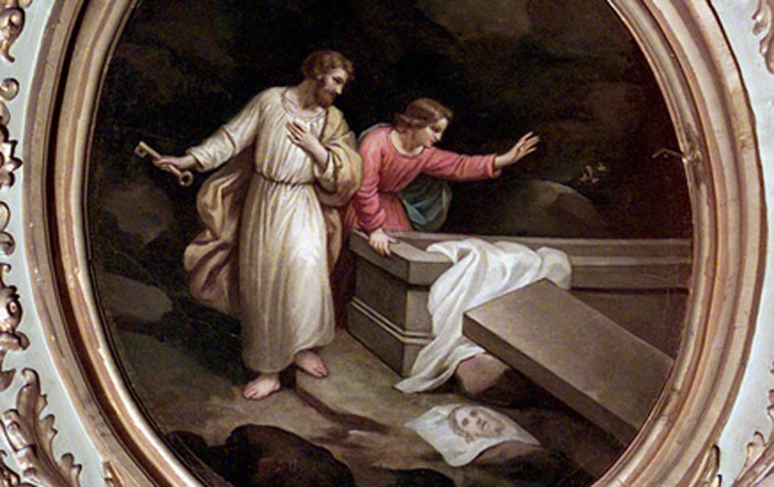 Giunge intanto Pietro che lo segue ed entra nel sepolcro prima di Giovanni: è a Pietro che si riconosce il primato conferito da Gesù nel gruppo dei dodici. Entrato nel sepolcro, Pietro osserva i teli e il sudario, che era stato disteso sul capo del cadavere. Vede che non è con i teli, ma avvolto in un luogo a parte. Lo sguardo di Pietro, che possiamo definire lucido e preciso, non riesce ancora a cogliere il mistero che in quel sepolcro si è realizzato. Egli si ferma ancora in un atteggiamento di incredulità.