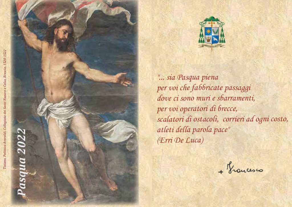 Se Pasqua è la voce del verbo ebraico che significa “passare”, se la Resurrezione è la vittoria definitiva sulla morte, su ogni morte, allora, mai come in questo momento oscuro della storia – Covid, guerra in Ucraina, conflitti bellici dimenticati nel mondo, vittime di ogni potere malavitoso, persone strozzate dalla morte dell’usura – facciamo nostro l’invito dello scrittore Erri De Luca che dice: “sia Pasqua piena per voi che fabbricate passaggi dove ci sono muri e sbarramenti, per voi operatori di brecce, scalatori di ostacoli, corrieri ad ogni costo, atleti della parola pace”.