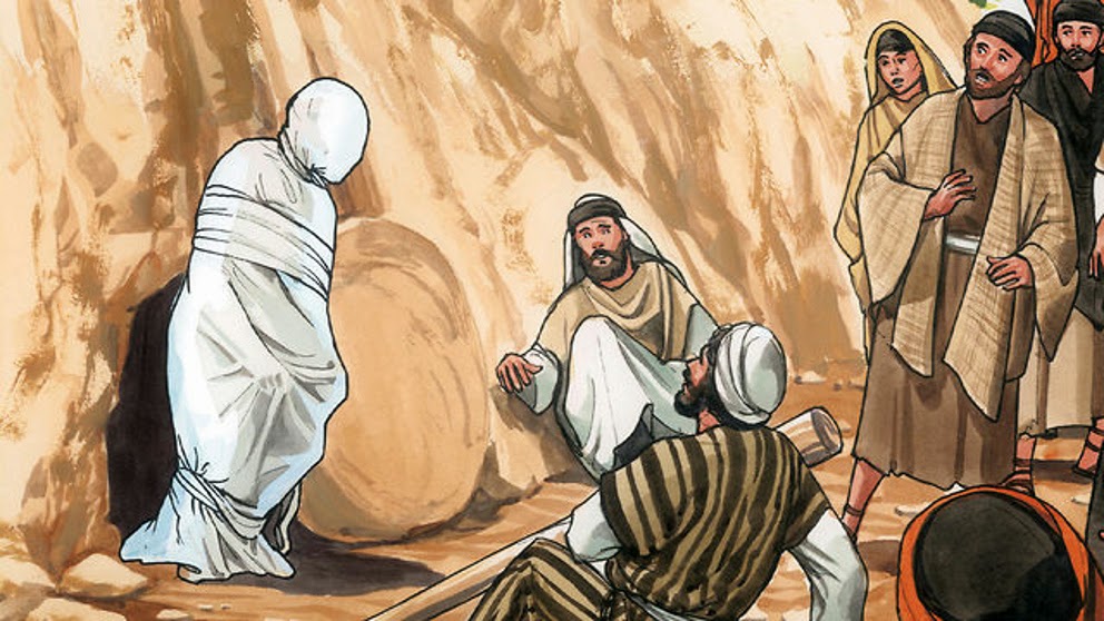 A questo punto Gesù, “ancora una volta commosso profondamente”, si reca al sepolcro e ingaggia un duello con la morte: chiede di togliere la pietra sepolcrale, alza gli occhi al cielo e dice: “Padre, ti rendo grazie perché mi hai ascoltato. Io sapevo che mi dai sempre ascolto, ma l’ho detto per la gente che mi sta attorno perché credano che tu mi hai mandato”. La preghiera di Gesù è testimonianza della sua relazione “unica” con il Padre ma è anche pedagogia perché ci fa comprendere che Egli è l’Inviato di Dio, tutto ciò che Lui è, parola e azione, è Dio.